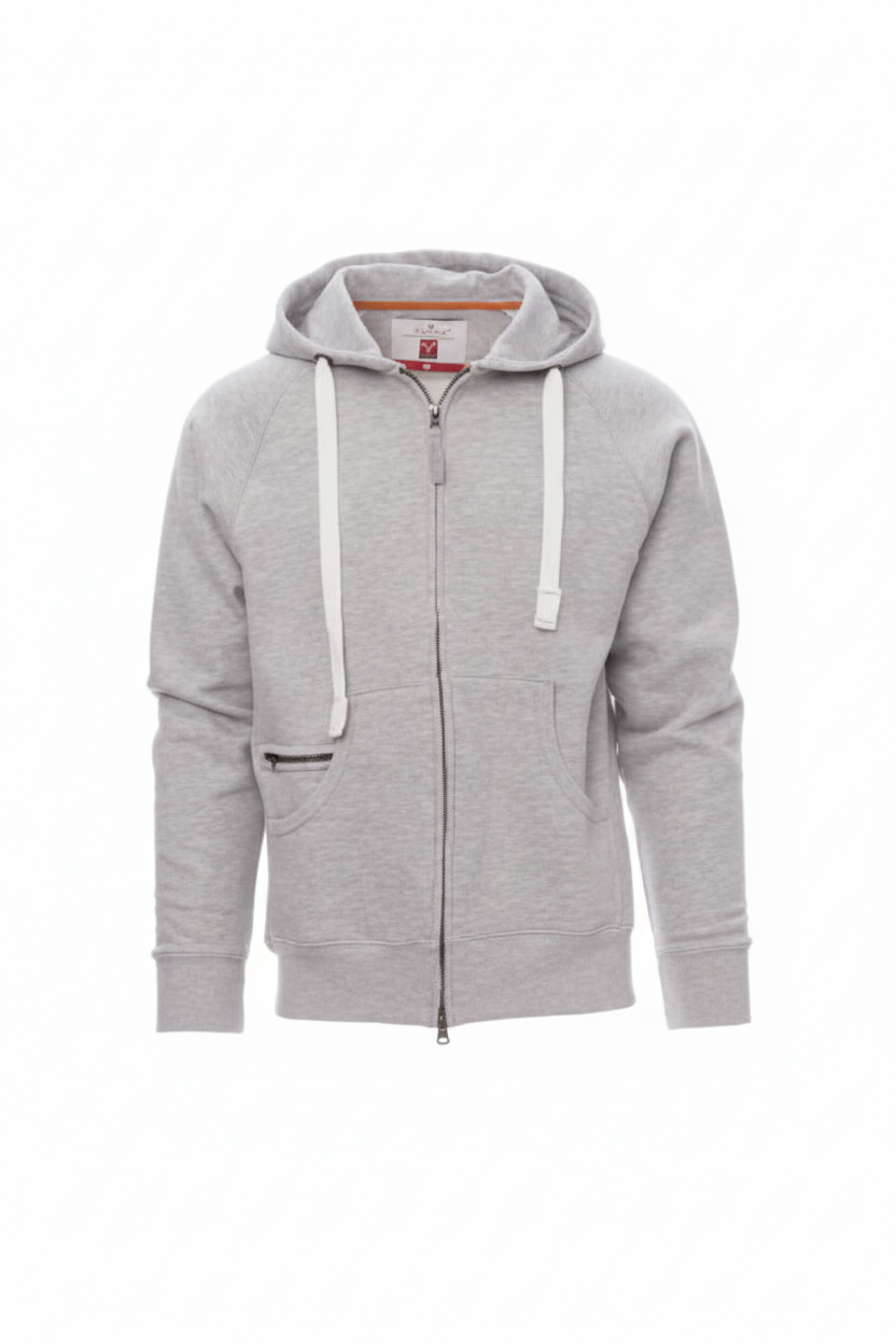 Men’s hoodie with full, plastic-covered SBS zip with double metal pull, hood with double stitched seams and white drawstring with contrasting stitching and metal rings, raglan sleeves, kangaroo pockets, small zip pocket, stretch rib cuffs and hem, reinforced seams